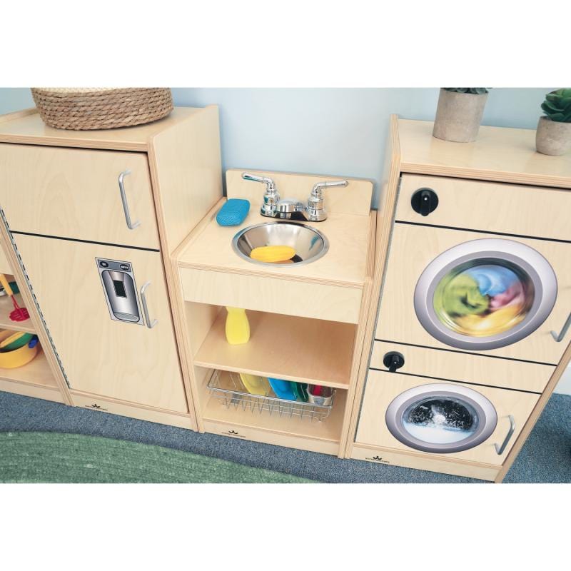 Just like home and right-sized for toddlers! Our Let's Play Toddler Sink features a fresh contemporary design and realistic details including a real chrome faucet and stainless sink bowl that will inspire a toddler's imaginative play for hours. Thoughtful safety features include smoothed edges, eased corners and open cabinets without doors to prevent little fingers from getting pinched. Combine our other Let's Play Toddler pieces [each sold separately] to create a complete toddler kitchen ensemble! Constructed in beautiful, durable birch plywood in safe, non-toxic natural UV finish that won't yellow and withstands rigorous use. Made in USA. GreenGuard™ Gold certified. Lifetime Warranty.