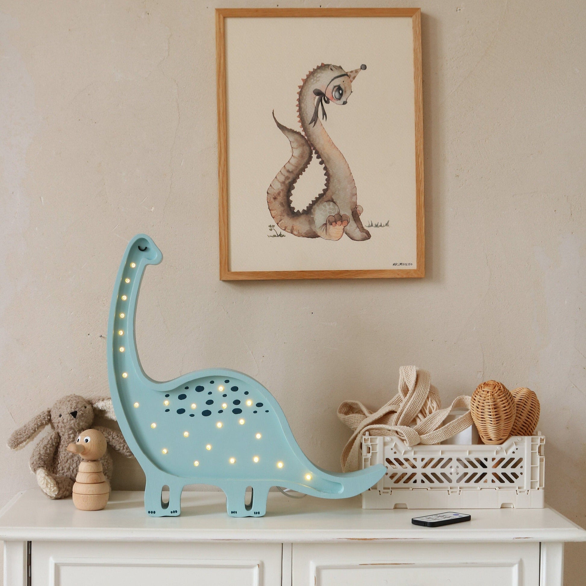 Our high-quality children's light is handmade from 100% natural pinewood, making it as strong and durable as it is beautiful. The Little Lights Dinosaur Lamp is a gentle giant who adds an aura of ancient wonder to your nursery decor. Give your little paleontologist the gift of a prehistoric pal by ordering one today! Please note the wood color is made to order and has a 4-8 week lead time.