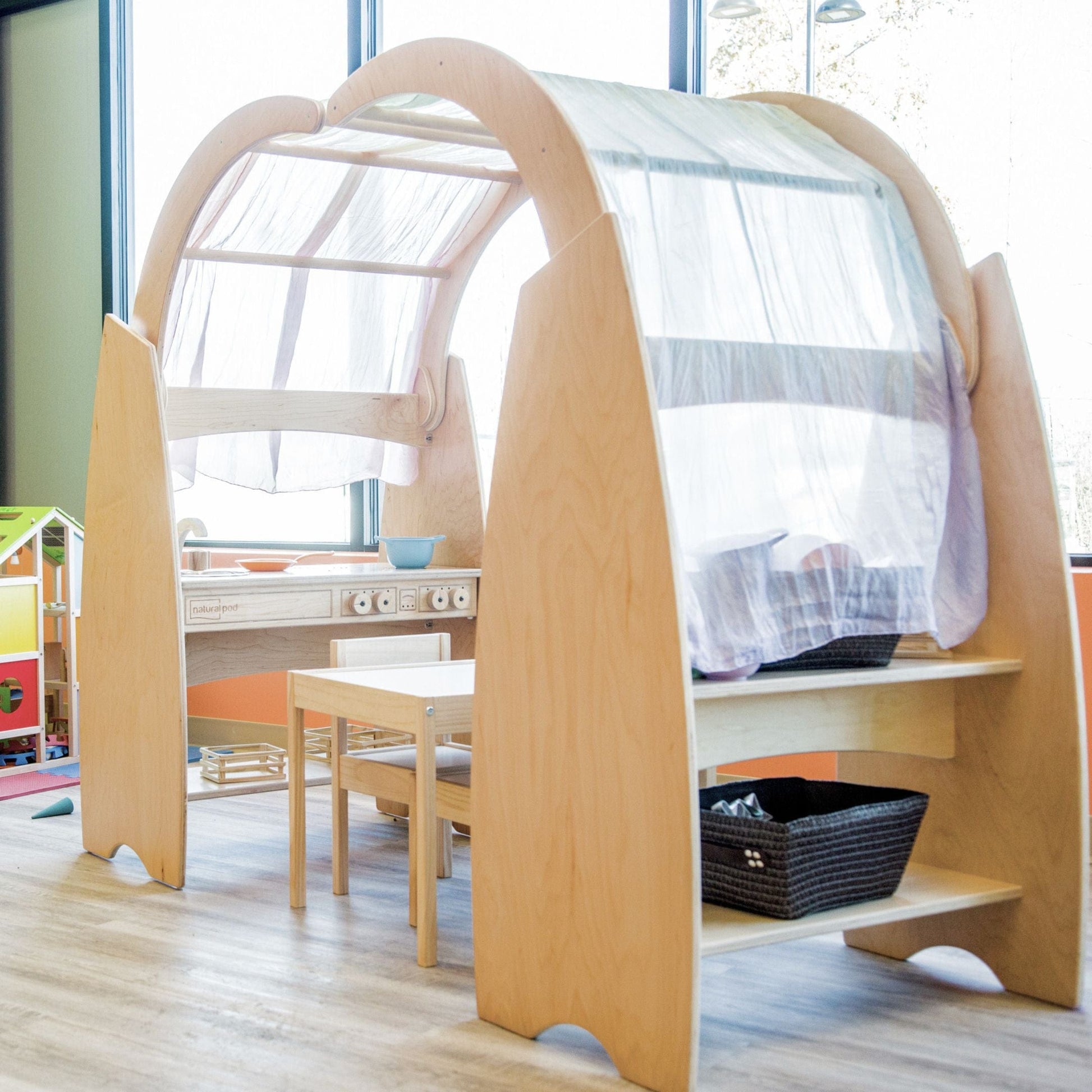 The Natural Pod Imagine Play Stand with removable arch encourages creative, open-ended play. It can be transformed into a store, a theatre, a house, the options are limited-less and easily made into cozy spaces that children love; throw some fabric over the top and you have a fort, a cave, or a reading nook. 12-14 Weeks lead time. Made to order.