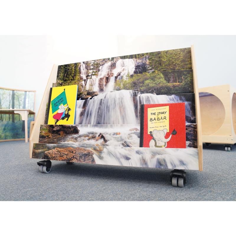 Who can resist the appeal of a gently cascading waterfall? The exclusive design of this mobile book browser features a captivating image that beckons a child to pick a book and sit down by the serene brook for a peaceful read. Isn't getting children to read the whole point? The front features four angled cascading display shelves with a lip that provides stable book display and maximum front cover visibility. On the back is a dry erase markerboard. Mounted on four heavy duty non-marking lockable casters for handy mobility. Coordinates perfectly with all other furniture pieces in our award-winning biophilia-inspired Nature View Collection.