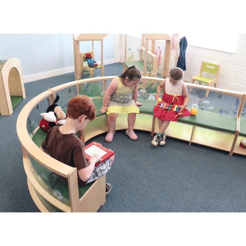This beautiful sofa features an open compartment for book storage beneath the seat and an innovative back panel constructed in safe, shatterproof clear acrylic imprinted with an inviting nature scene that coordinates with all other pieces [each sold separately] in our award-winning biophilia inspired Nature View Collection. Combine with other Nature View Straight or Curved Sofas [each sold separately] to form a horseshoe, circle, S-shape or other inviting and flexible learning area that children will love! All corners and edges are rounded over and finished smooth for safety. Fitted matching green seat cushion and floor glides included. Constructed in safe, shatterproof acrylic and beautiful, durable 15mm birch plywood in non-toxic natural UV finish that won't yellow and withstands rigorous use. Made in USA. GreenGuard™ Gold certified. Lifetime Warranty.