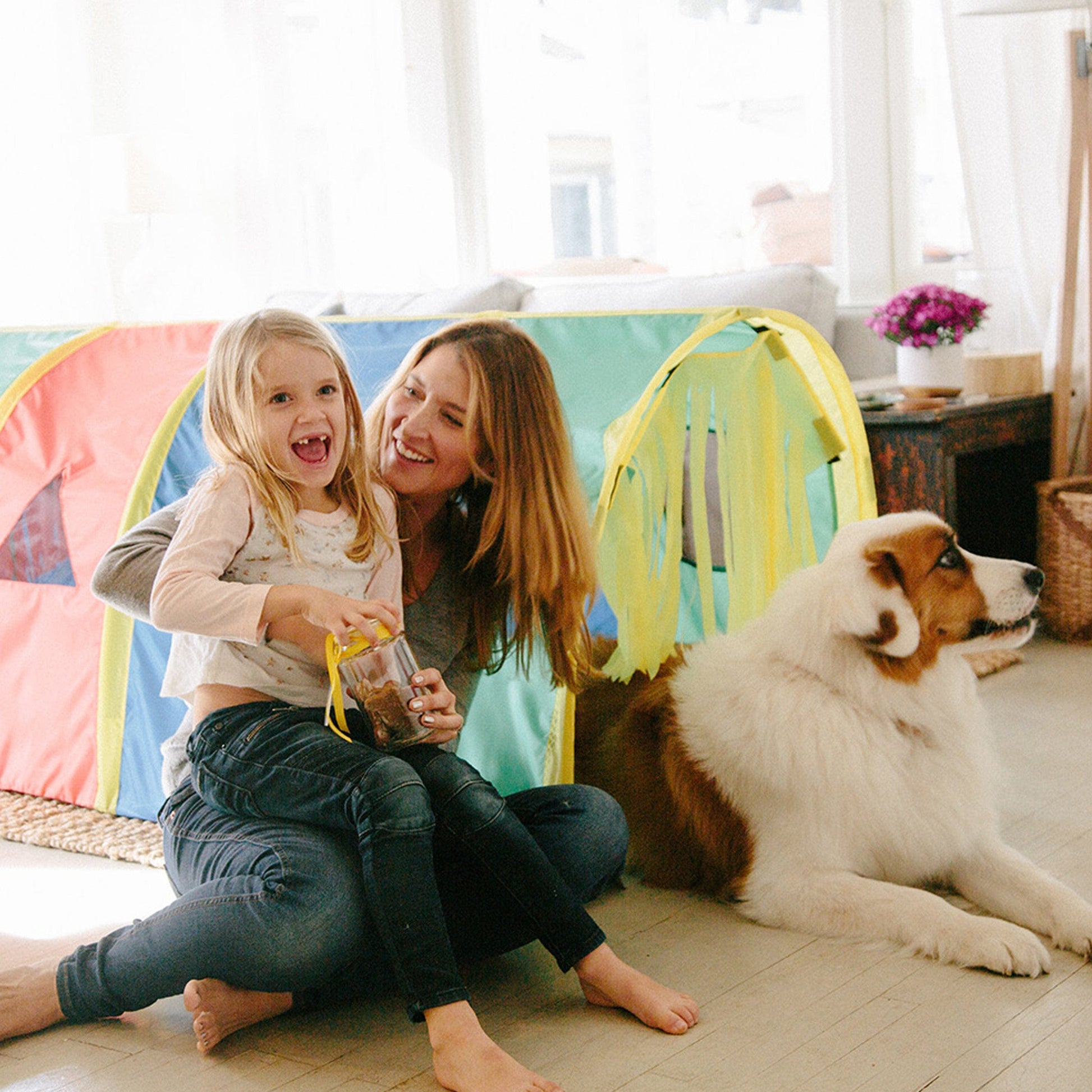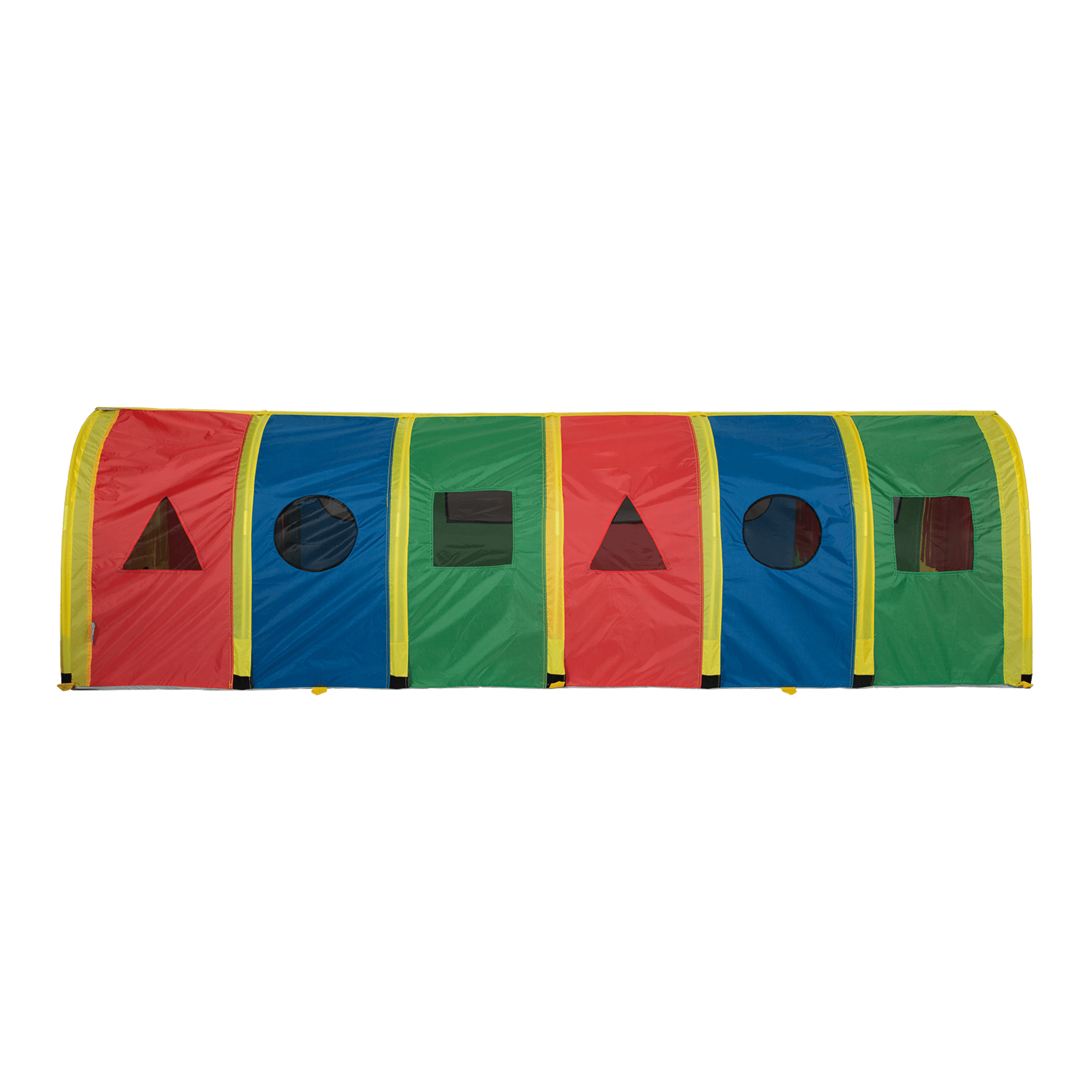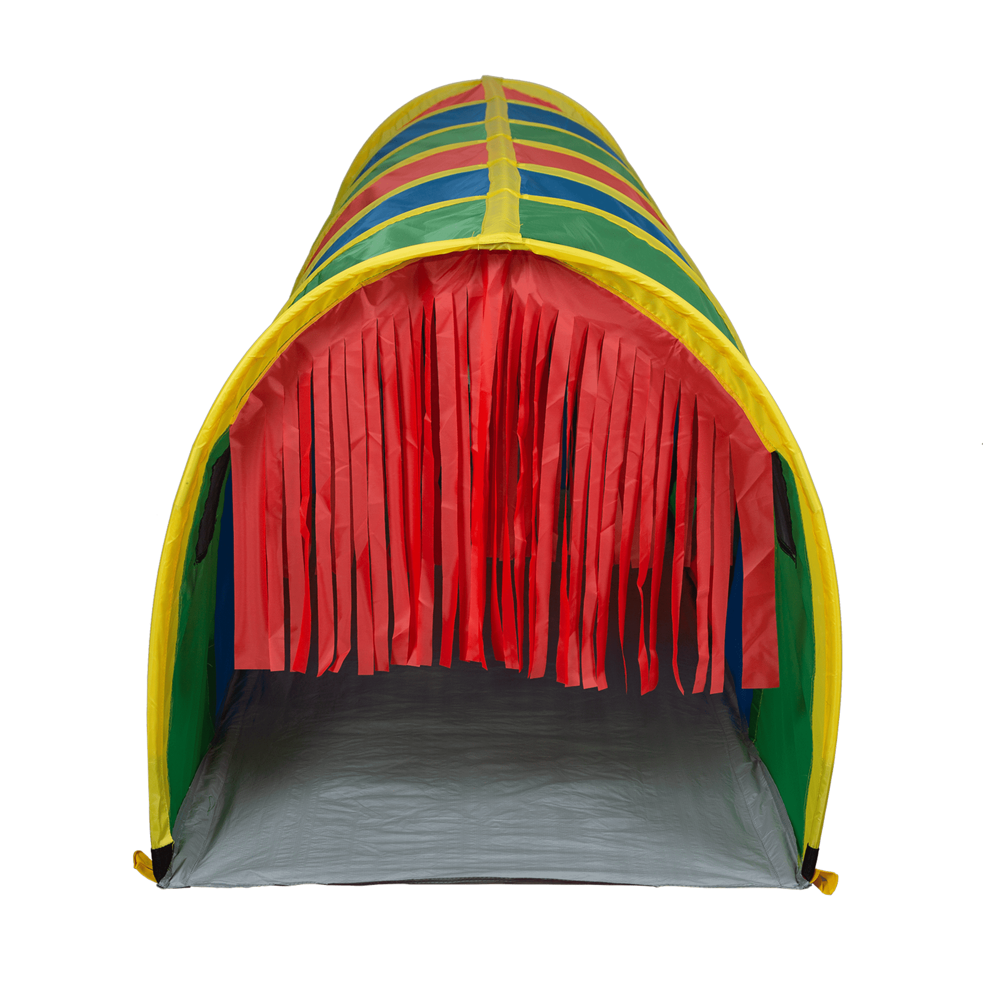 Low Inventory.  Experience unlimited imaginative play with our Super Sensory 9FT Tunnel! Pretend you're on a super-secret mission, going through the car wash or connect to our other tents and tunnels for the ultimate maze. The multicolored streamers promote sensory stimulation, and the shape cutouts allow for endless games or educational opportunities. It folds up easy for travel and helps build motor skills and muscle all while having fun!