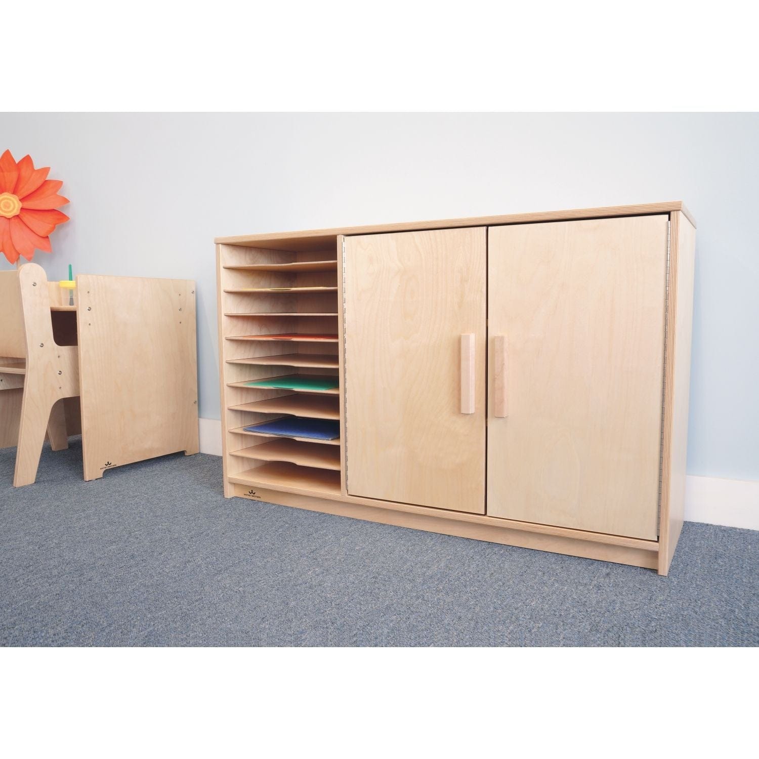 Part of the award-winning Whitney Plus Collection, this beautiful cabinet features nine open shelves for paint drying or art paper storage and two fixed shelves behind the doors provide ample storage for art supplies and larger items. Continuous piano hinges on the doors prevent little fingers from being pinched, an important safety feature. Constructed in beautiful 3/4-inch birch plywood with no visible screws or joinery for a fine finished furniture look in natural UV finish that won't yellow and withstands rigorous use.