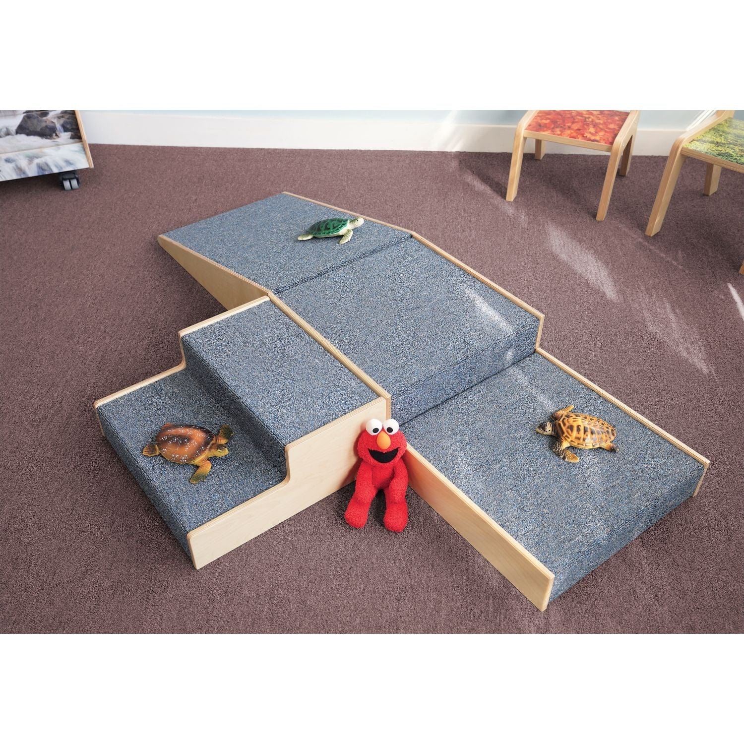 Learning to become a biped is no easy task! This complete four piece set of varied terrain Woodscapes blocks provides challenging fun and encouragement for first-movers to build their mobility, coordination and confidence through exploration and play. Change the layout to challenge their motor skills as they develop! The carpeting material is 100% BCF blue olefin fiber (synthetic, CPSIA compliant), renowned for its strength, colorfastness, comfort and resistance to stain, mildew, abrasion and fading from sunlight. The set includes one each of the following four Woodscapes blocks: WB1470 Large Platform, WB1471 Small Platform, WB1472 Ramp, WB1475 Steps.